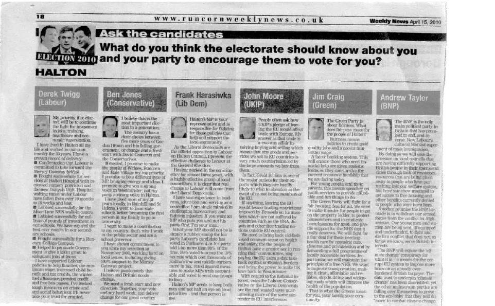 Each week until polling day, the Widnes and Runcorn Weekly News is asking readers to submit a question for all of the candidates to answer. The first question was "Why should the electorate vote for you?". My answer is below;